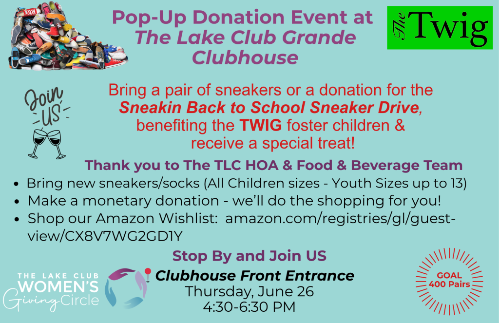Bring a pair of sneakers of donation for the Sneakin Back to School Sneaker Drive benefiting the TWIG foster children and receive a special treat!